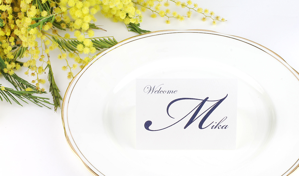 Paper Item Design No.04 スタイリッシュなカリグラフィフォントを使って、ゲストの名前一人ひとりシンプルに刻みました。 余白感を大切に、品のあるクラシックな雰囲気に仕上げました。