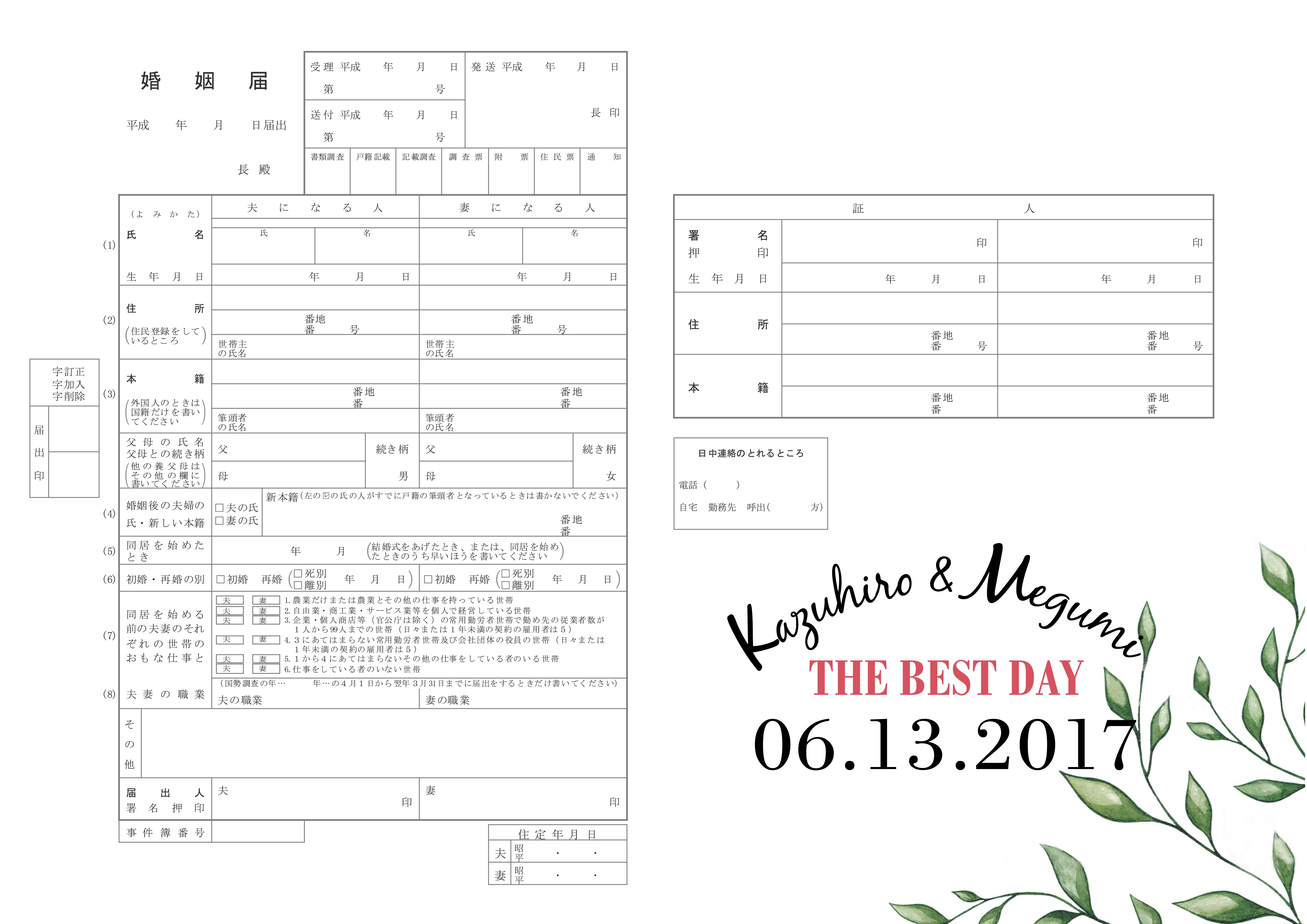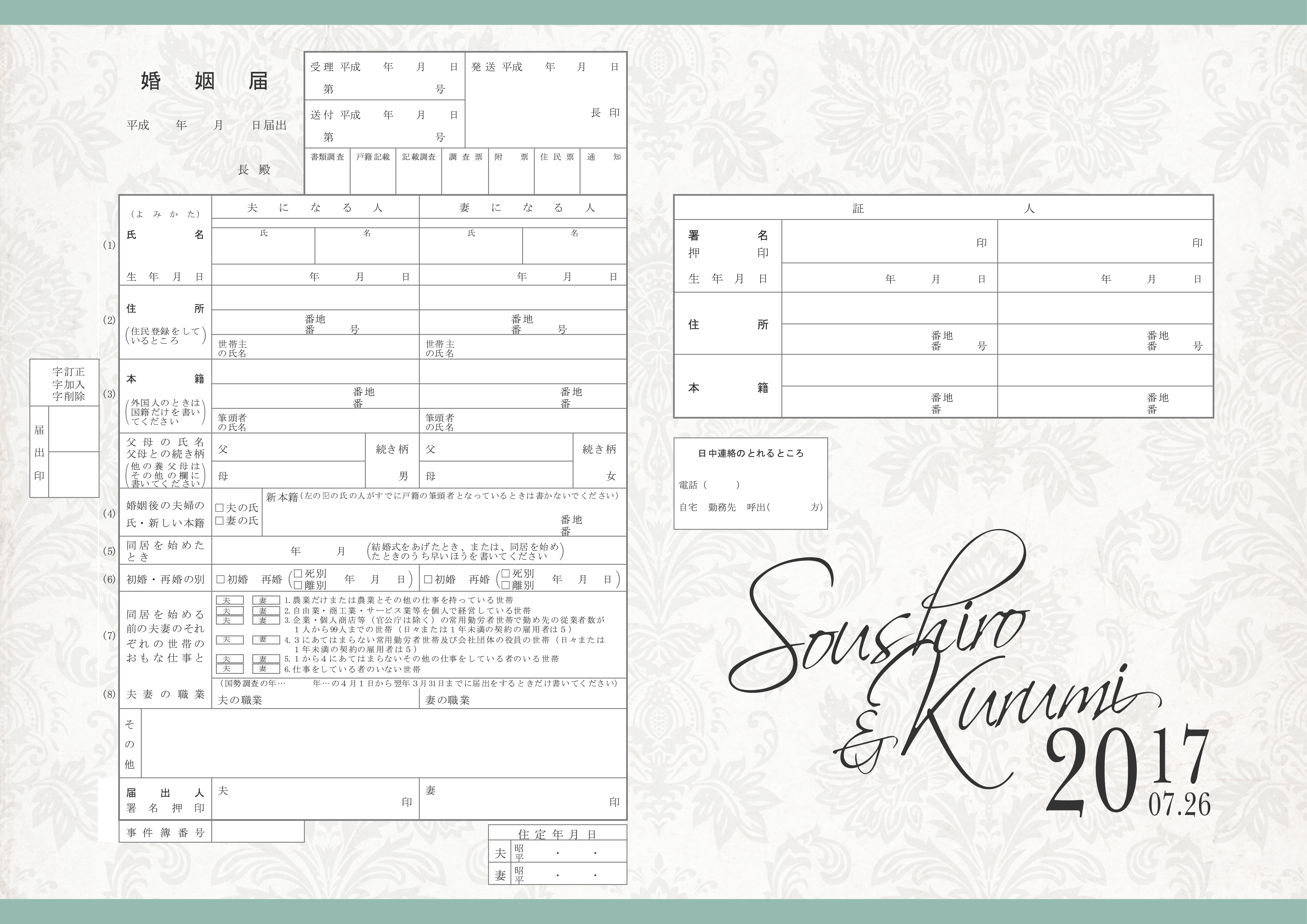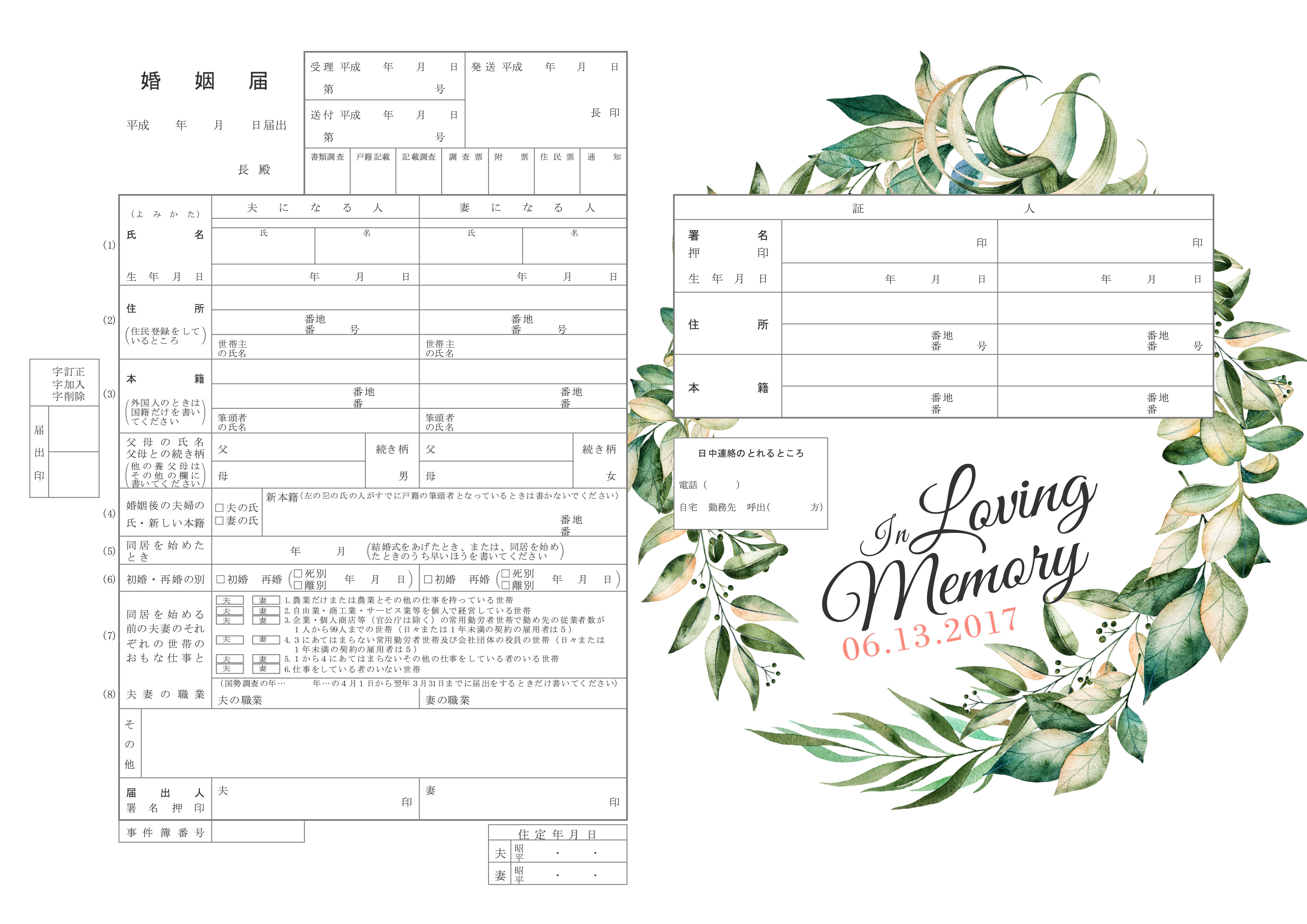 Marriage Registration Design No.02-1 おしゃれでシンプルなデザインの婚姻届。 背景にグリーンのアクセント。 二人の名前と記念日をアレンジしたあなただけのオリジナルデザインです。 sor […]