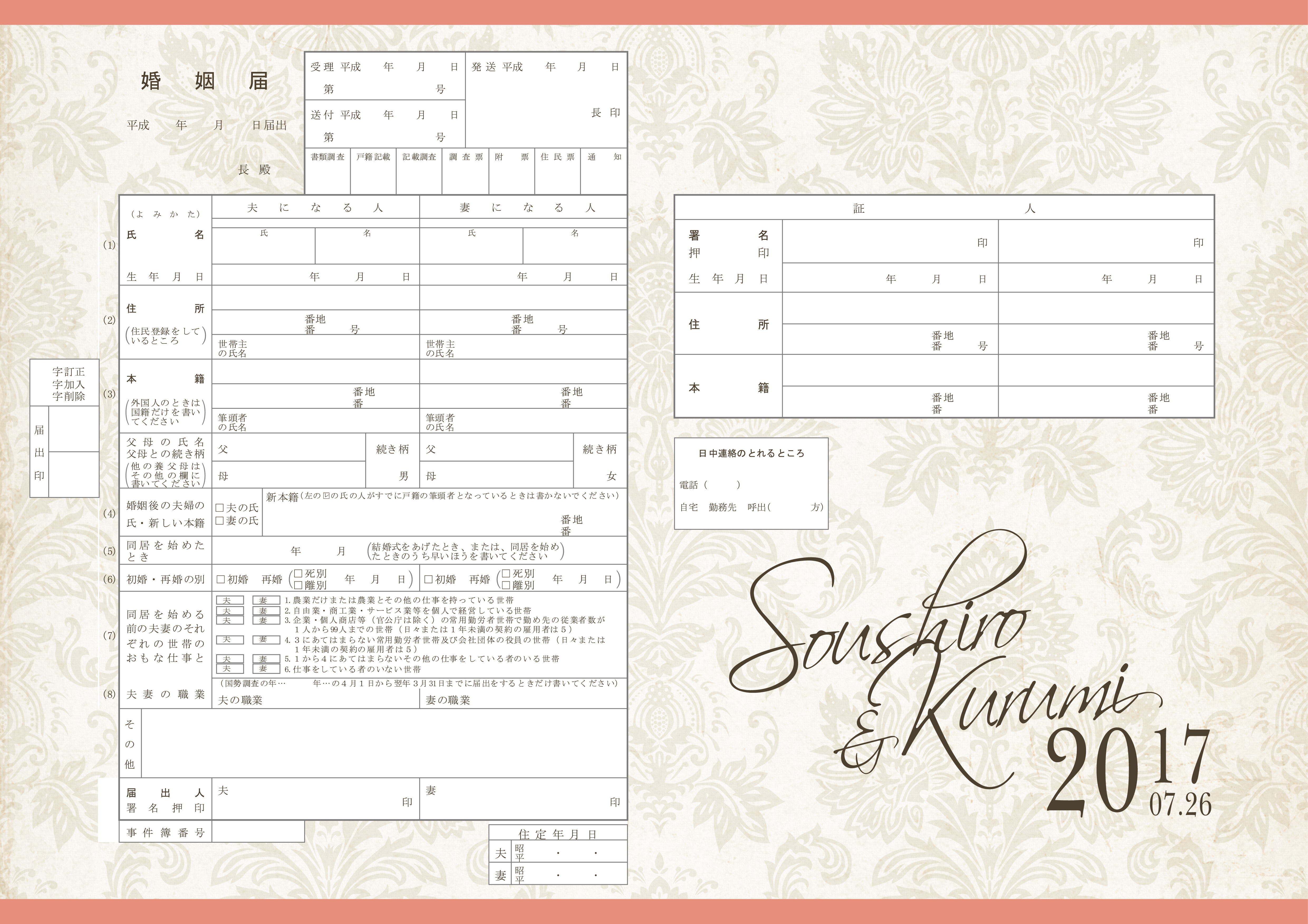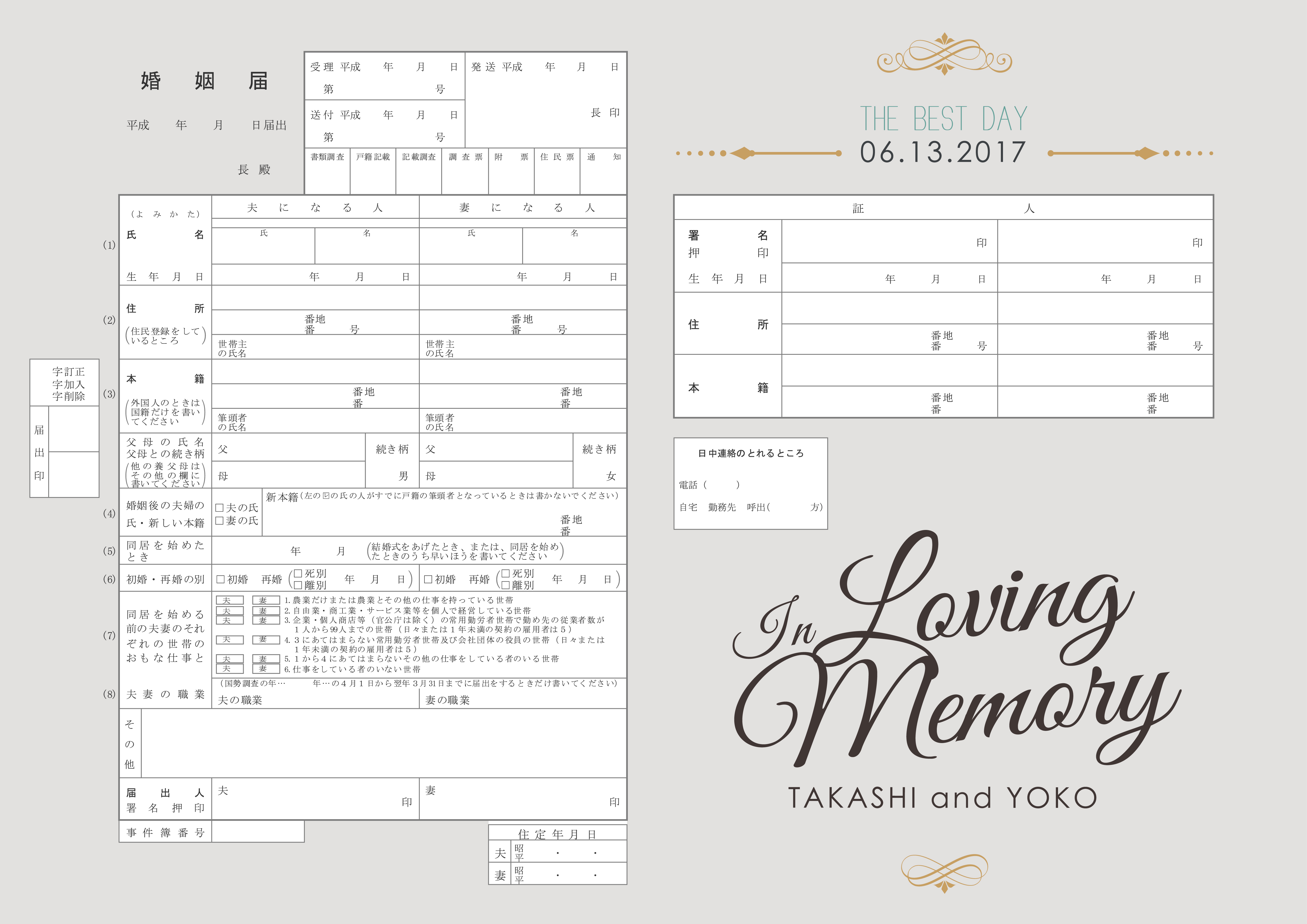 Marriage Registration Design No.03-2 おしゃれでクラシックなデザインの婚姻届。 大きめに入るタイポグラフィが印象的。 背景はクラシックなライトグレーカラー。 二人の名前と記念日をアレン […]