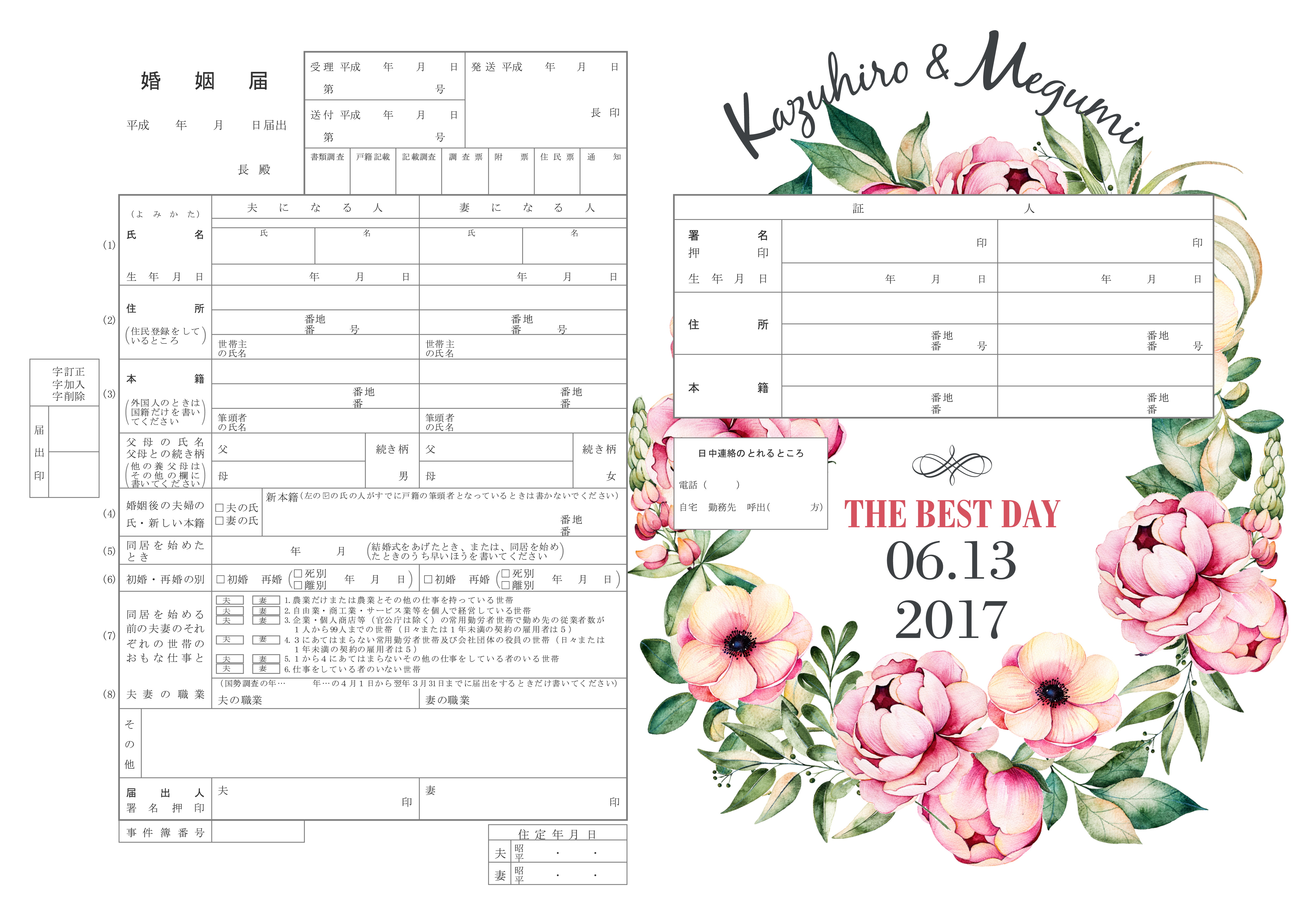 Marriage Registration Design No.02_2 おしゃれで可愛いデザインの婚姻届。 背景にピンクのラナンキュラスや様々なグリーンを使ったリースの絵をたっぷりアレンジしたかわいらしいデザイン。 二 […]