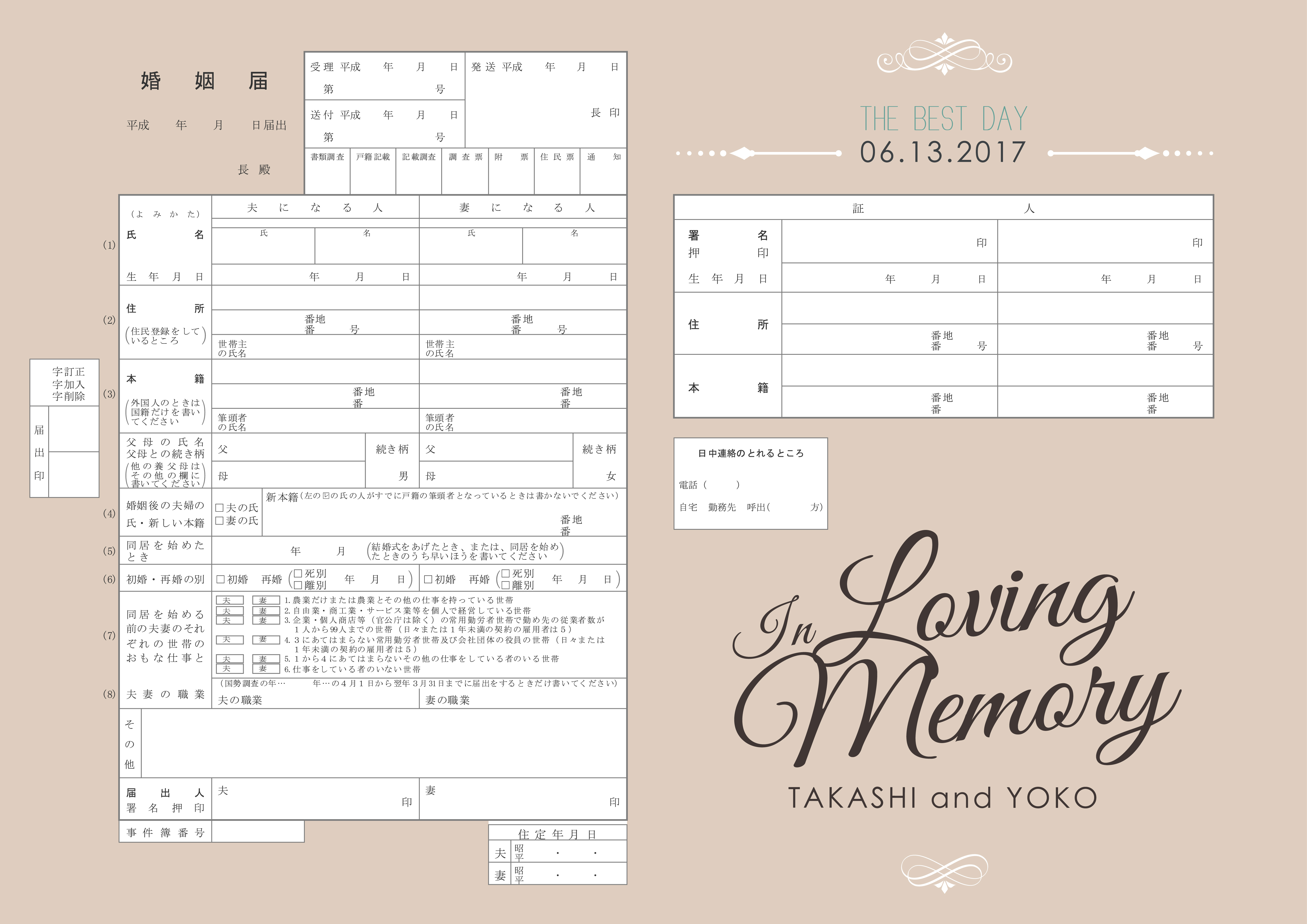 Marriage Registration Design No.03-1 おしゃれでクラシックなデザインの婚姻届。 大きめに入るタイポグラフィが印象的。 背景はクラシックなライトブラウンカラー。 二人の名前と記念日をアレ […]